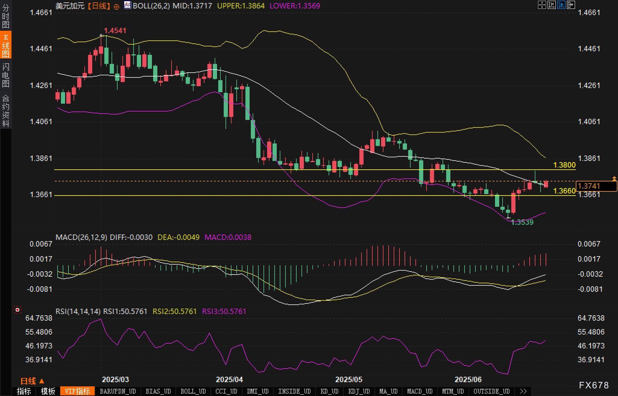中长期展望: 基本面中性偏空,分析认为若美元指数维持弱势、油价止跌回升,加元有望逐步企稳并重拾升势。反之,若美联储维持鹰派基调或油价跌破关键支撑,则美元/加元可能重返1.38上方区间震荡。