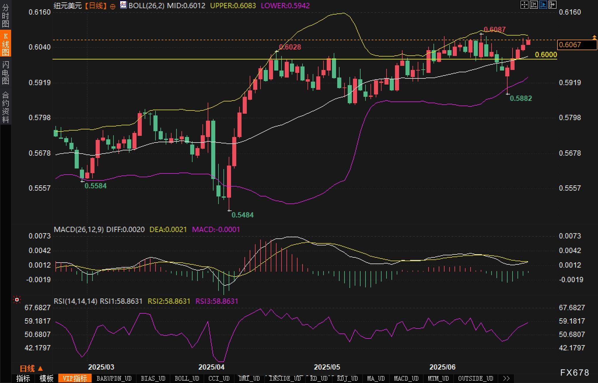 支撑位参考:0.6000(整数关口+前期整理平台),分析认为若跌破则关注0.5942(布林带下轨);