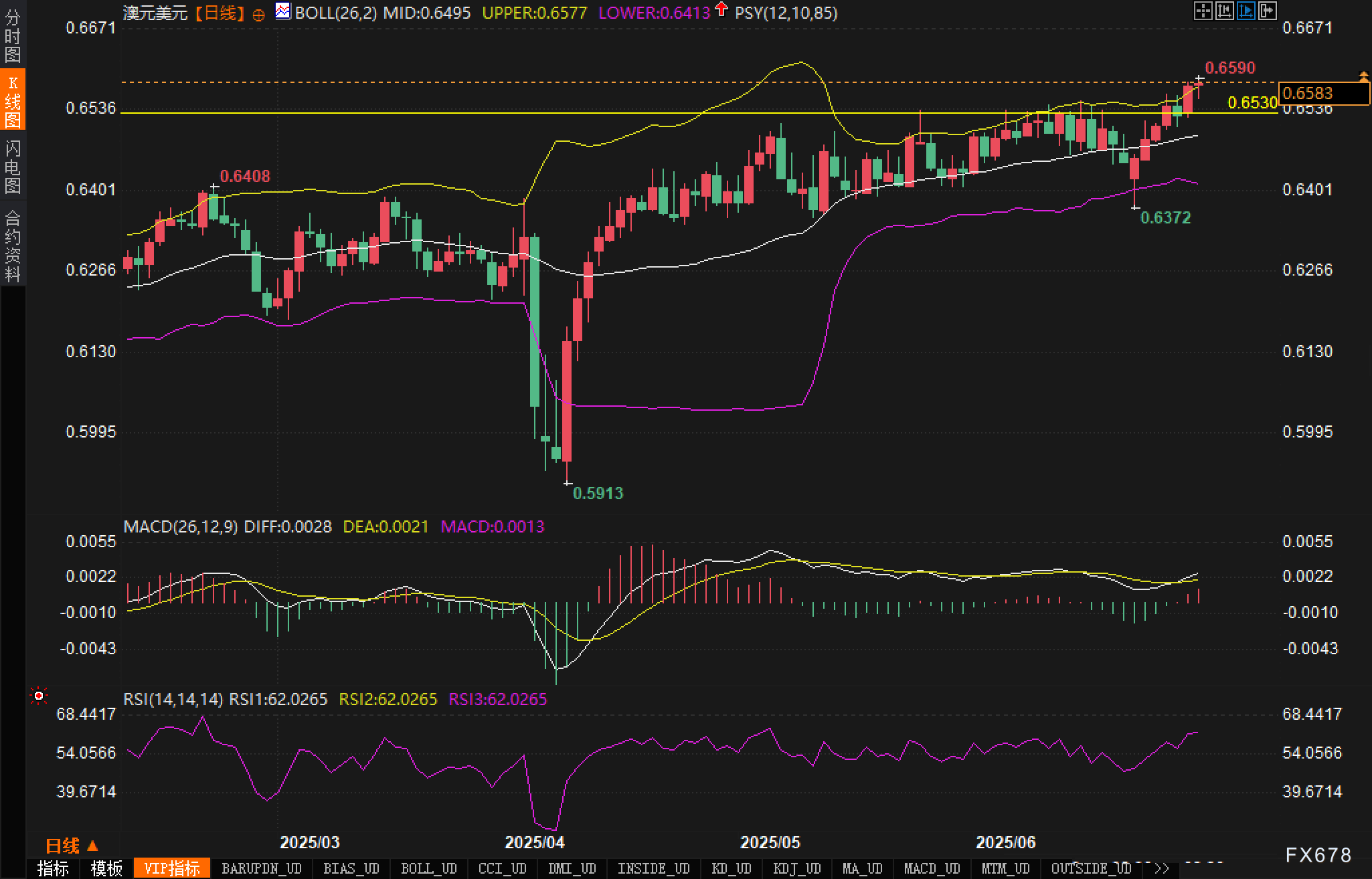 分析认为当前支撑位关注前期突破口0.6530,若守稳将为后续冲击0.6610-0.6660区间创造条件。若跌破该位,则需警惕短线回测中轨0.6495的可能。