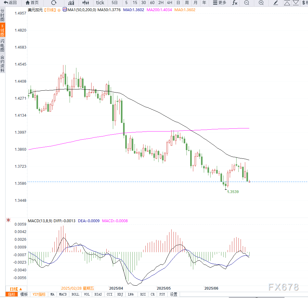 美元兑加元短期走势受到美加贸易政策修复与美元系统性疲软双重影响。若美国本周数据疲软,或联储官员语调鸽派,汇价有望跌破1.3570关键支撑位,转向1.3520测试区域。
