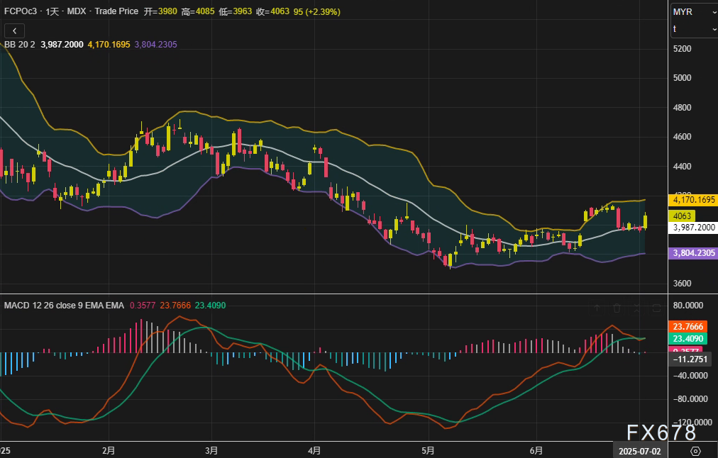 exness外汇官网——周三(7月2日),马来西亚衍生品交易所(BMD)棕榈油期货结束连续两日跌势,主力9月合约FCPOc3收报4063林吉特/吨,单日涨幅2.39%,创下近一周新高。技术指标显示,价格突破布林带中轨3987林吉特,MACD柱状线收窄至0.3577,短期动能有所修复。