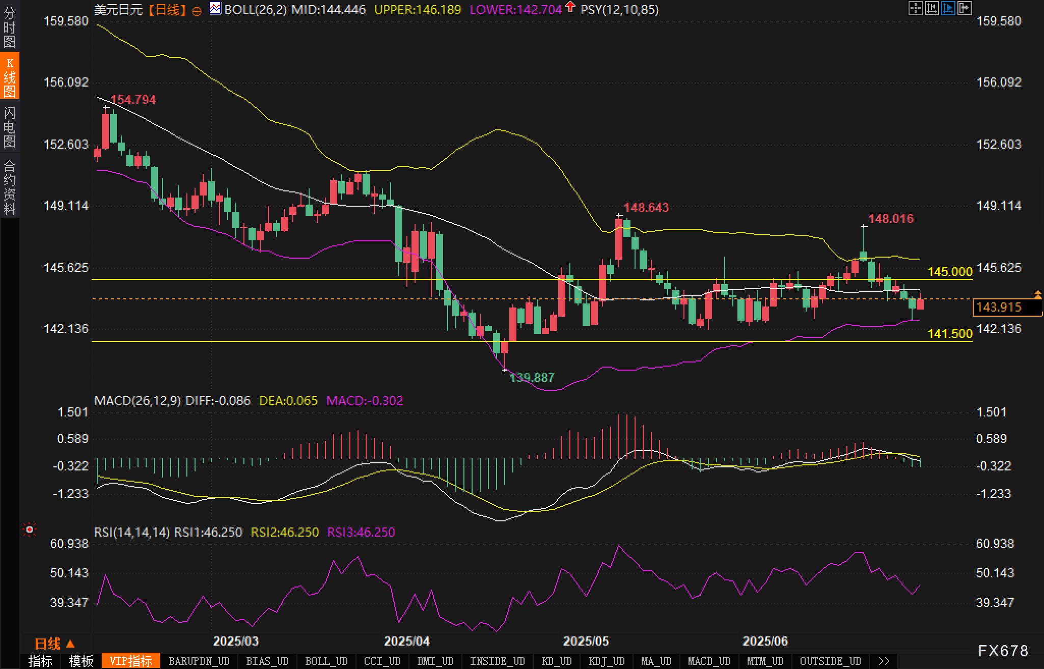 K线方面,当前K线组合呈现多次冲击上方145.00阻力未果,形态上形成“三顶”结构雏形;与此同时,141.500一线构成下方关键支撑,分析认为若失守该位,将打开下探4月低点的空间。