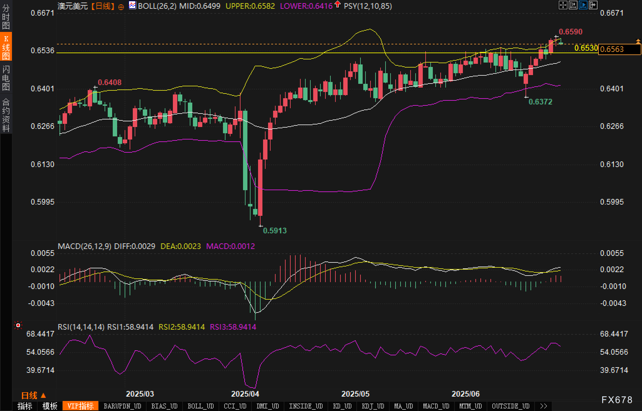 从AUD/USD日线图观察,汇价自低点0.5913一线反弹至今,整体构建出一个温和上升通道,并在近期成功突破布林带上轨压制,触及0.6590的年内新高,确认突破成立。