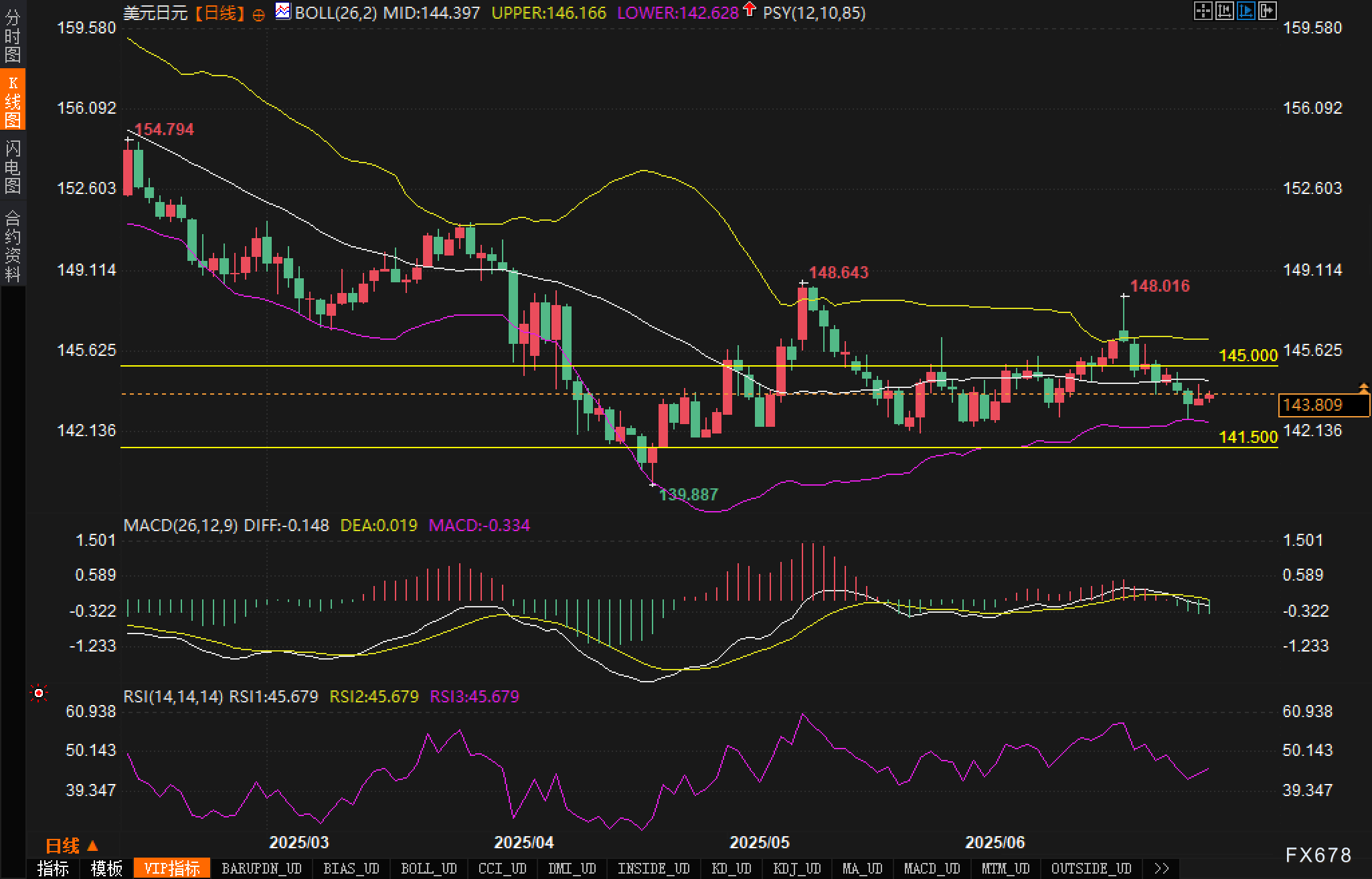 美元/日元正处于关键的技术转折点。从日线图来看,汇价在经历了此前的大幅下跌后,目前在142.50-145.00区间内形成矩形整理格局。布林带显示汇价运行在中轨附近,上轨位于146.17,下轨位于142.63,带宽收窄反映出波动性的收缩。