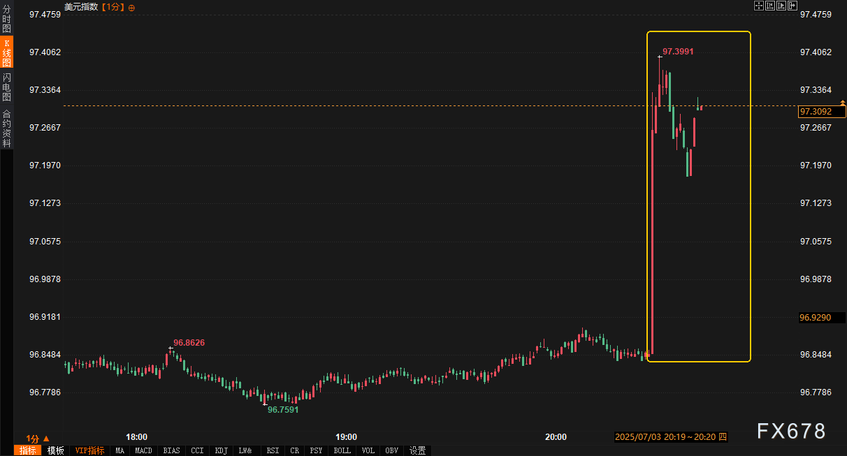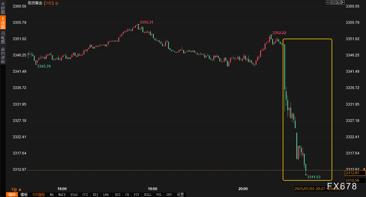非农数据公布后,金融市场迅速做出反应。美元指数短线暴涨约55点,突破97.00关口,最高触及97.3991,创4个交易日新高,日内涨幅达0.59%。美债市场同样躁动,10年期国债收益率上涨6.7个基点至4.359%,2/10年期收益率曲线趋平,反映市场对未来经济预期的调整。避险资产则全线承压,现货黄金跳水约40美元,最低触及至3311.53美元/盎司,日内跌幅扩大至1.32%,COMEX黄金期货主力合约报3325.6美元/盎司,跌幅1.01%。