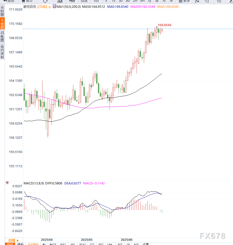 技术面来看,EUR/JPY当前接近近一年高点170.00关口,短线仍维持多头趋势。日线图显示,汇价稳居5日与10日均线之上,MACD红柱扩大,动能积极,RSI位于65附近,未进入超买但动能偏强。