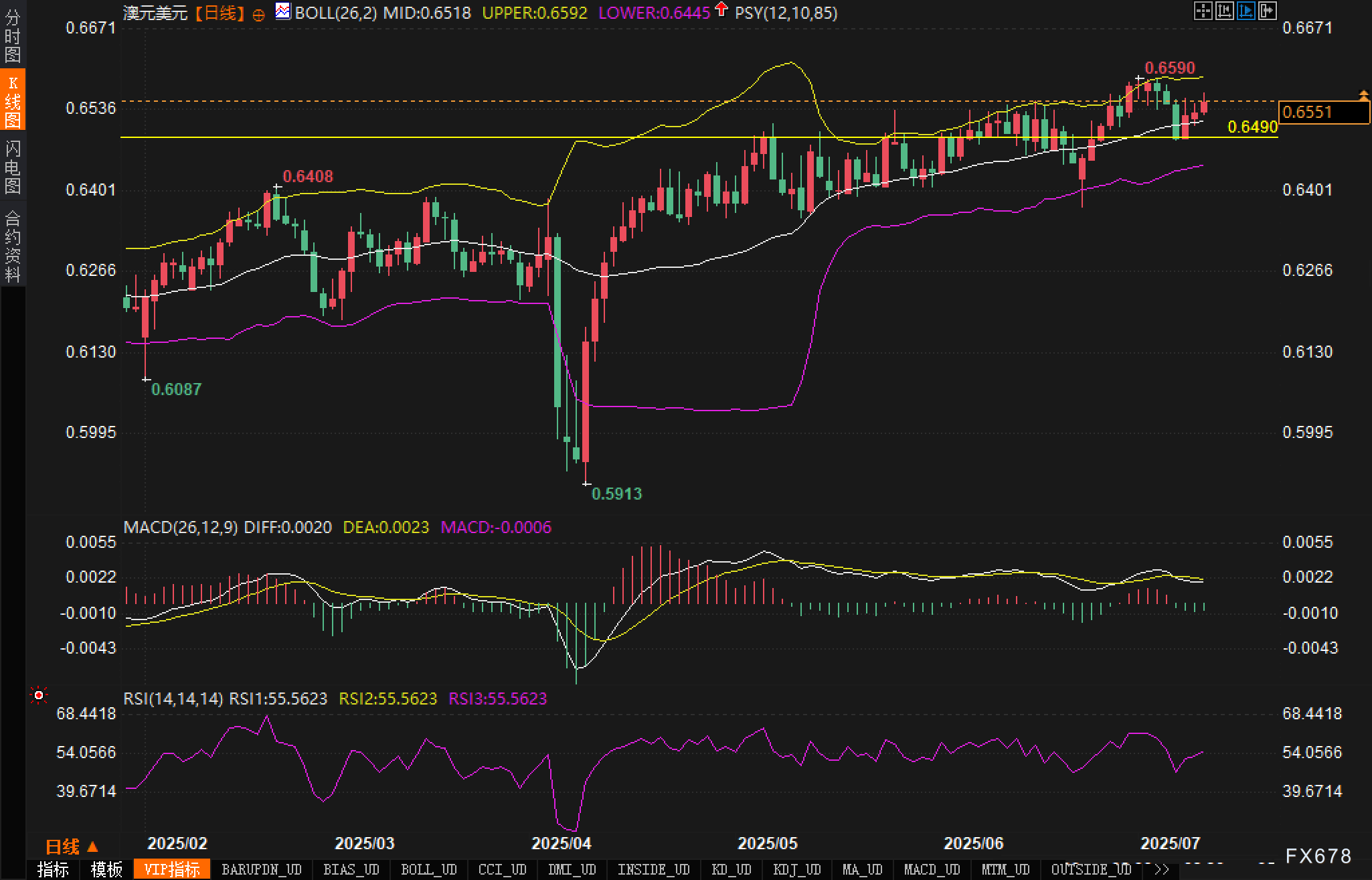 相对强弱指标(RSI)徘徊于55附近,处于中性偏强区域,说明当前买盘略占上风但尚未形成突破共识。分析认为若后续向上突破0.6590,将打开通向0.6670区域的上行空间;反之,跌破0.6490则恐引发下行加速,测试0.6445甚至0.6400一线。