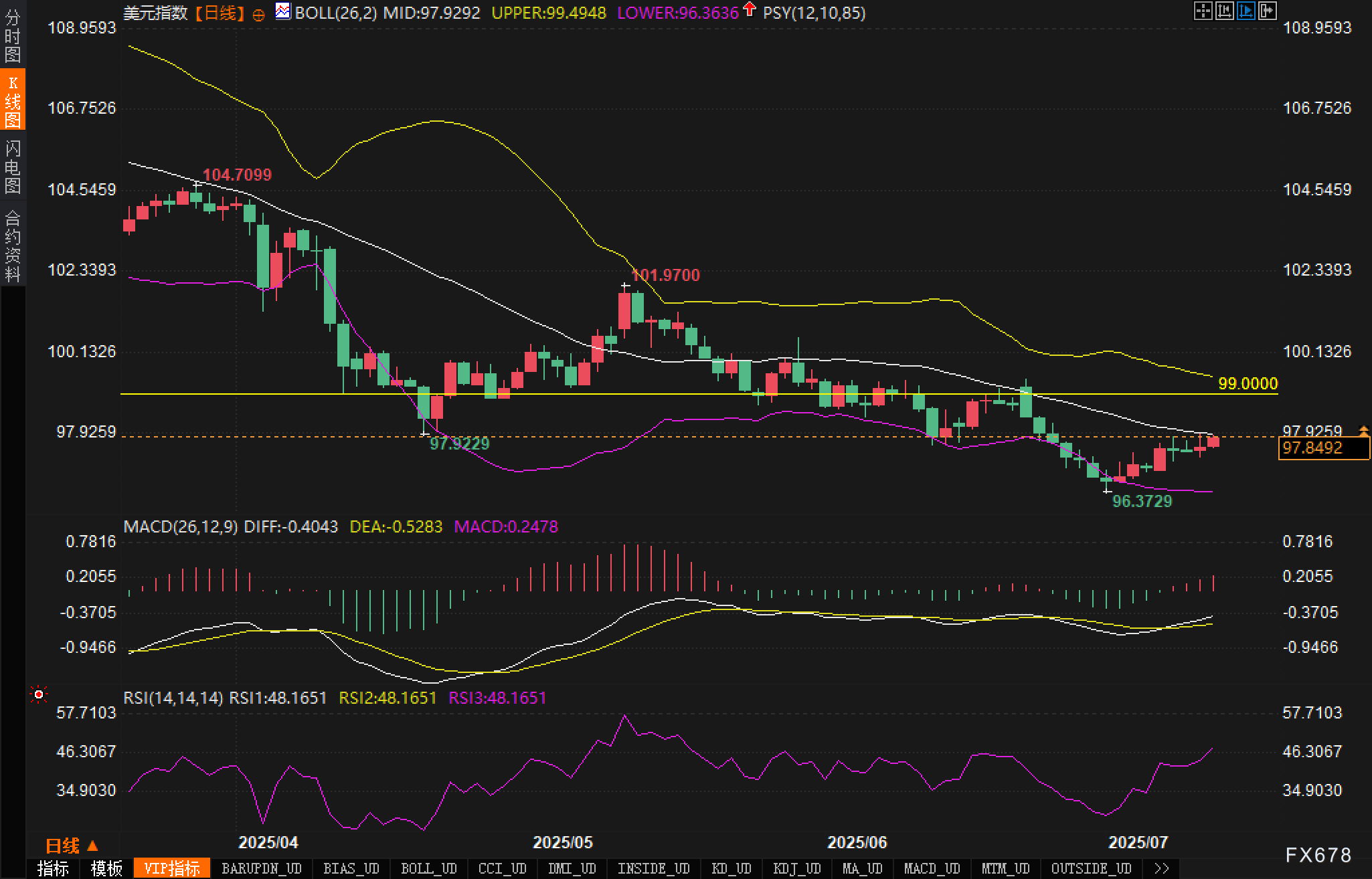 短期展望:分析认为美元指数短期内维持反弹结构不变,但反弹动能有限;当前需关注能否有效突破布林中轨与99.00一线压力区间,若突破失败,或再度陷入低位区间的整理。