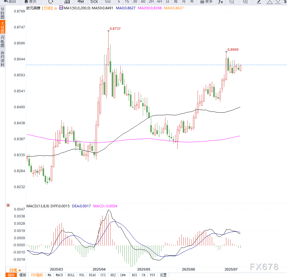 技术层面看,EUR/GBP当前处于上升通道内部,上方关键阻力位于0.8640和0.8670区域。若有效突破,可能打开进一步上行空间,测试年内高位0.8705。
