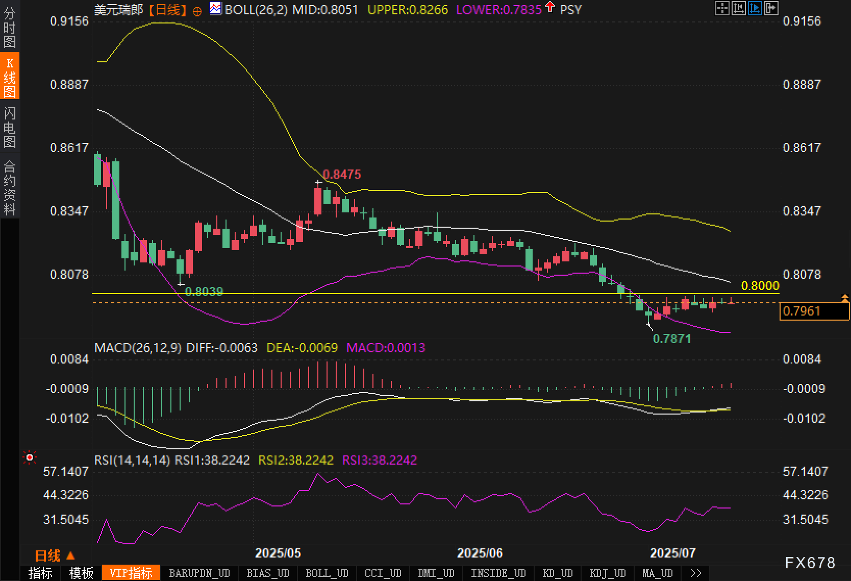 从日线图来看,美元兑瑞郎汇价自高点0.8475以来持续下行,目前运行于布林带中轨与下轨之间,构成典型的下降趋势通道。汇价近期一度探底至0.7871后出现技术性反弹,但始终受制于布林中轨(0.8051)压制,反弹力度有限。