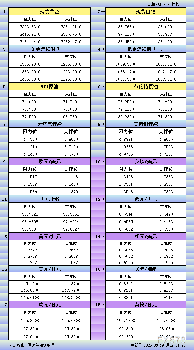 exness集团:6月19日美市更新支撑阻力:18品种支撑阻力(金银铂钯原油天然